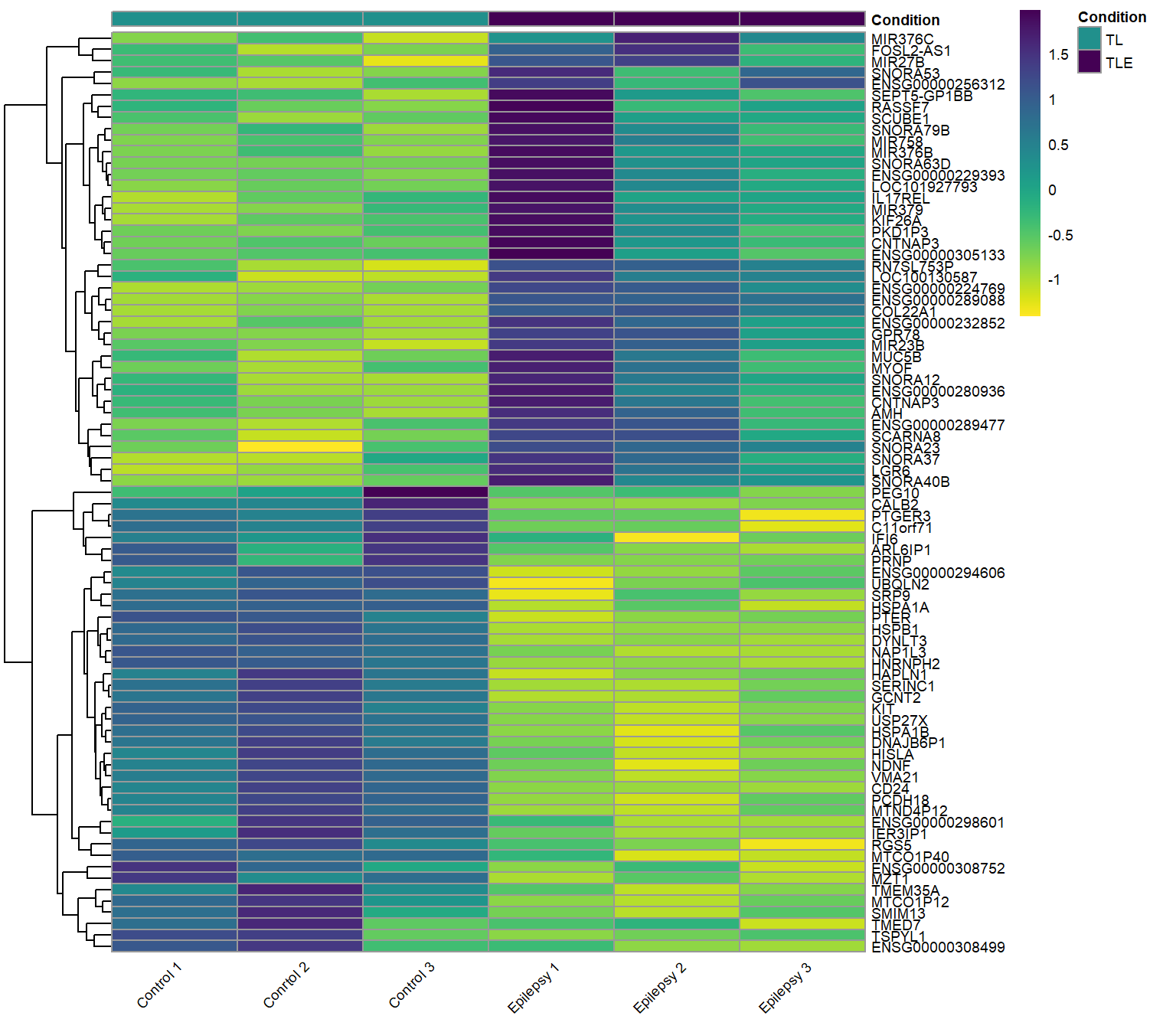 status <- c('Control', 'Epilepsy')Temporal lobe neurons of Epilepsy patients (TLE) vs. Temporal lobe neurons of Control post-mortem tissue (ref.) differential expression analysis results